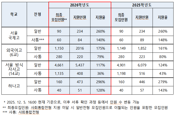 서울특별시교육청(교육감 정근식)은 12월 3일부터 12월 5일까지 모집한 2026학년도 국제고, 외국어고, 자율형 사립고(이하 자사고) 자기주도학습전형 원서접수 현황을 발표했다.